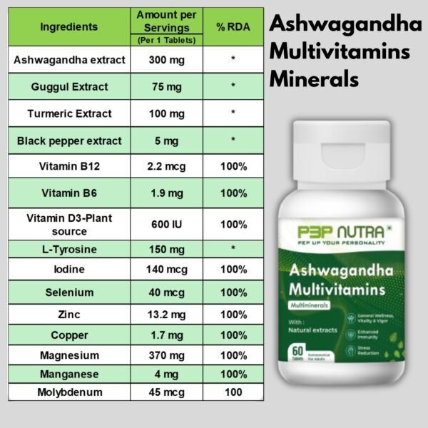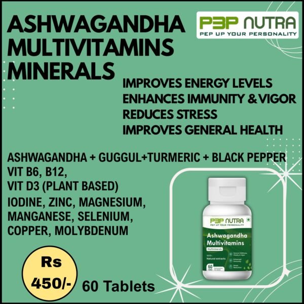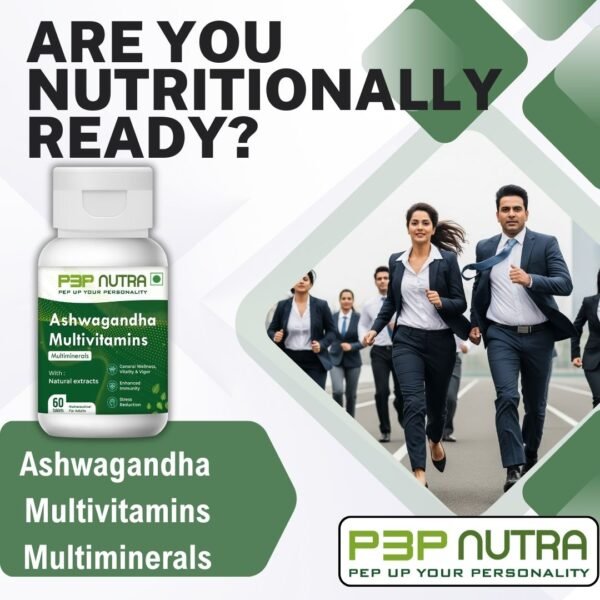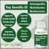 Ashwagandha Multivitamins & Multiminerals from P3P Nutra is a unique vegan blend of essential vitamins, minerals, and plant extracts (including ashwagandha) to boost energy, lower stress, boost immunity, and help the body reach its maximum potential.