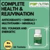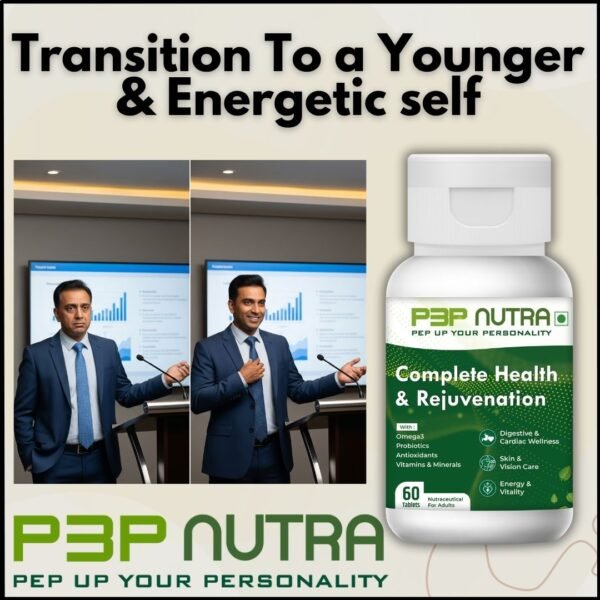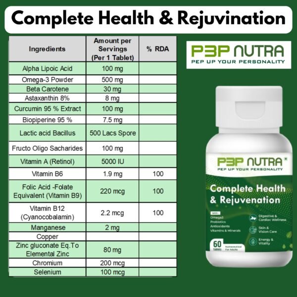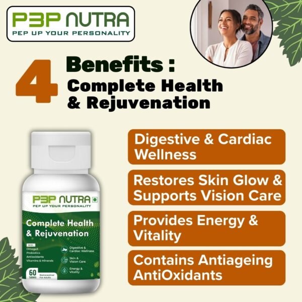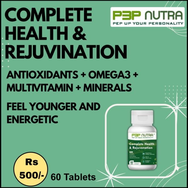 Complete Health & Rejuvenation supplement from P3P Nutra is a Advanced combination product with Balanced mix of Prebiotics, Probiotics, Antioxidants, Omega-3, Vitamins and minerals to keep you feeling younger and Energetic. This combination helps support all functions of body.