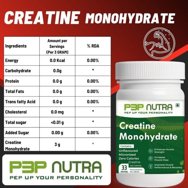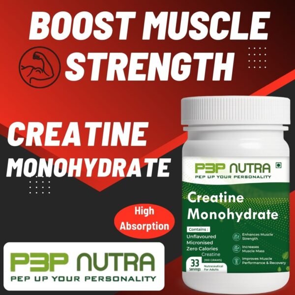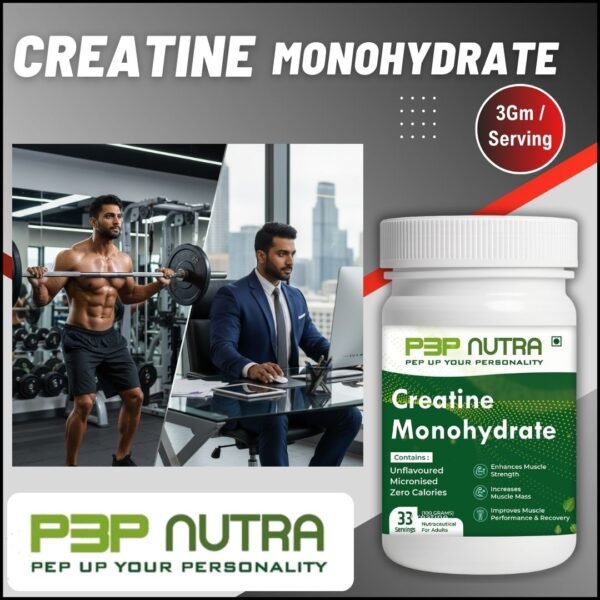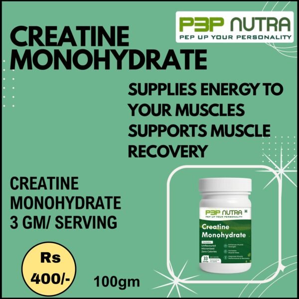 Creatine Monohydrate from P3P Nutra improves energy production, guards against muscle damage, and speeds up muscle recovery. It promotes brain health and gives muscles more energy.