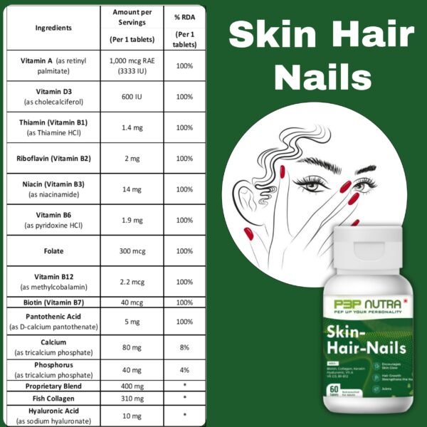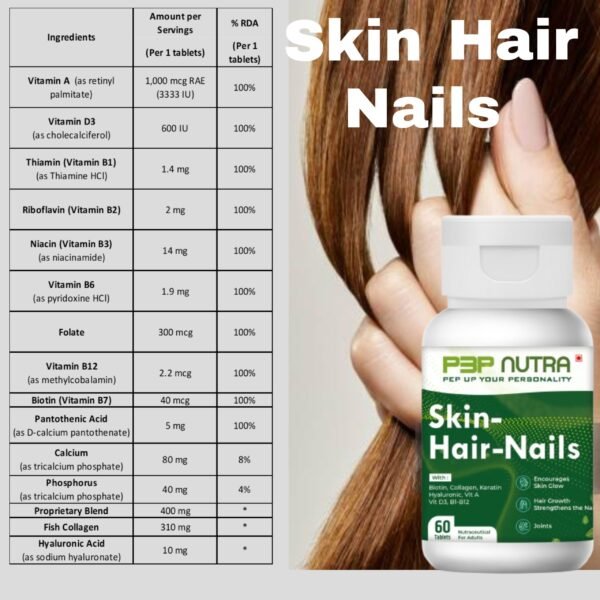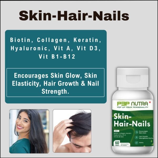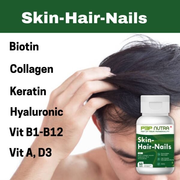 Skin-Hair-Nails from P3P Nutra is a special blend of specific supplements that promotes skin elasticity and glow, enhances hair growth, stimulates hair follicles, fortifies nails, and strengthens joints.