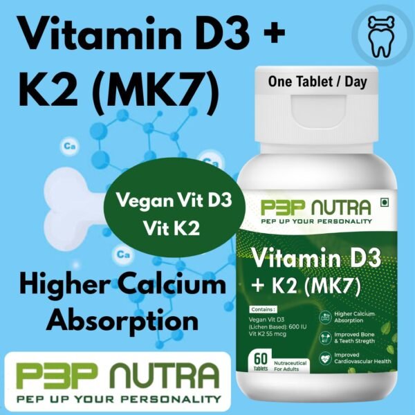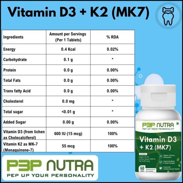 It contains Vit D3 (600IU) lichen sourced + K2 (MK7)-55mcg is specialized product to enhance calcium absorption and ensure integration into bones. This specialized combination of Vitamins also ensures safety of cardio vascular system.